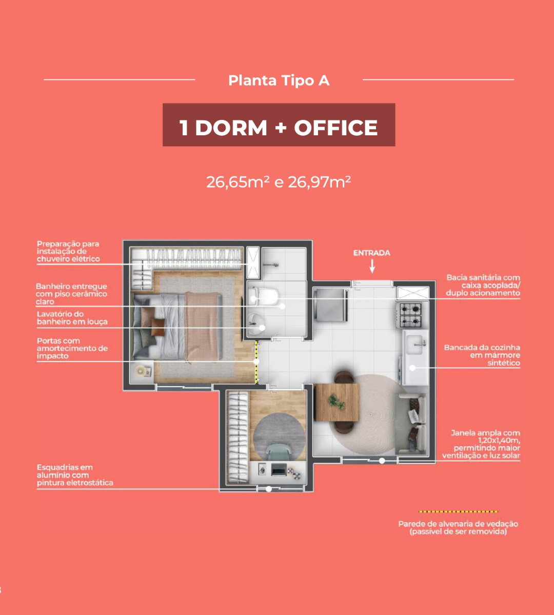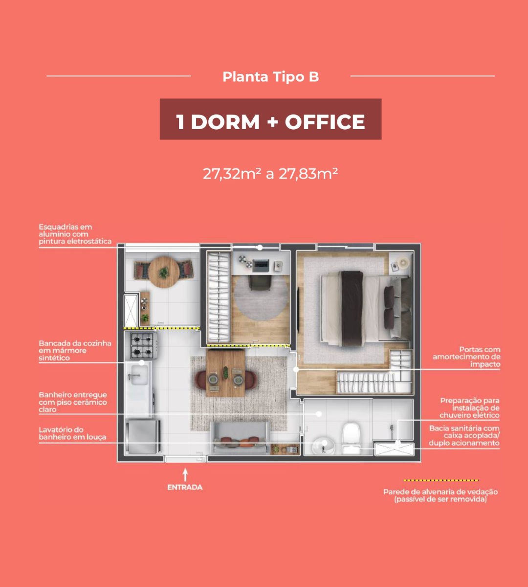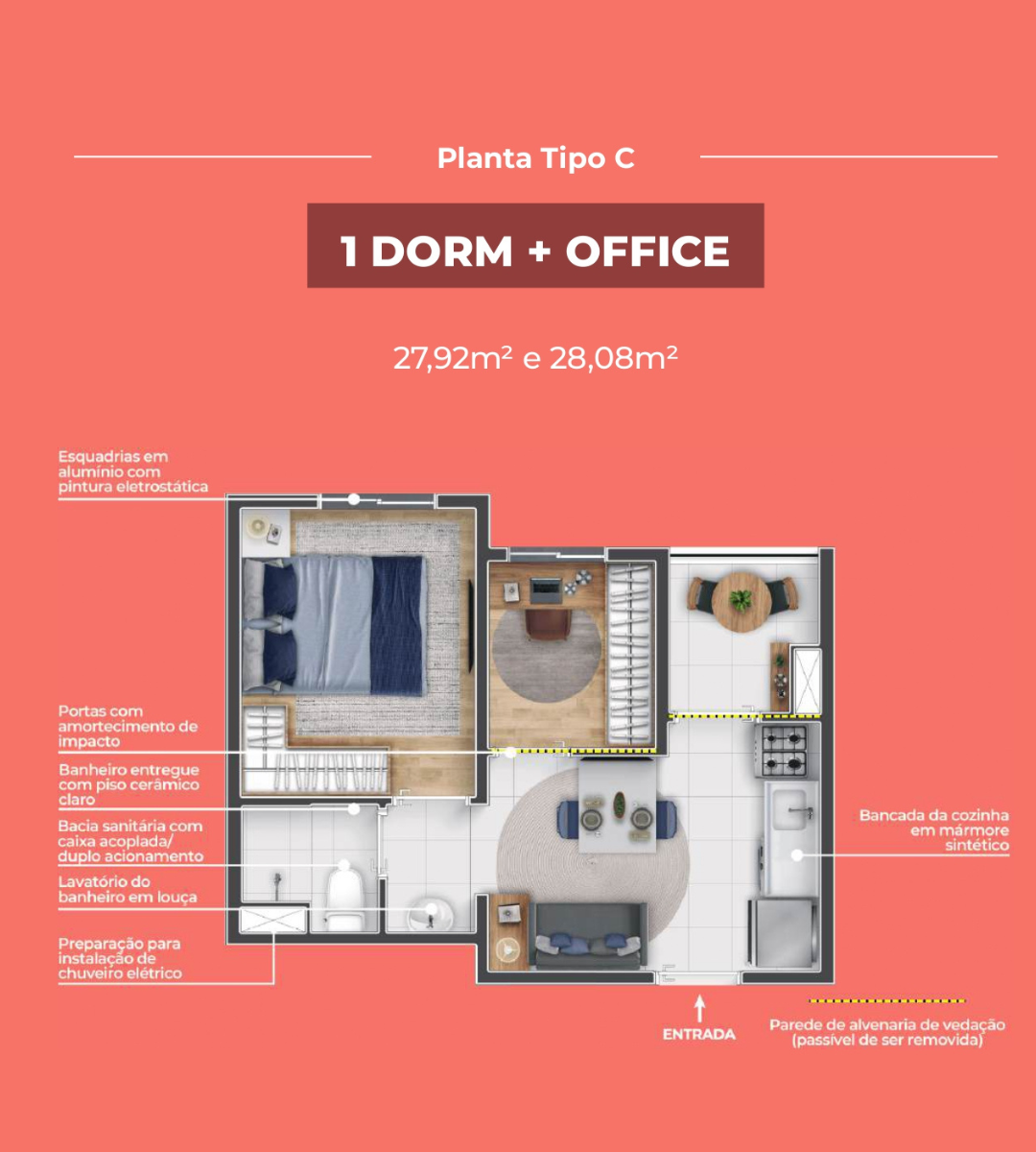 1 Dormitório + Office – 26 a 28 m²
